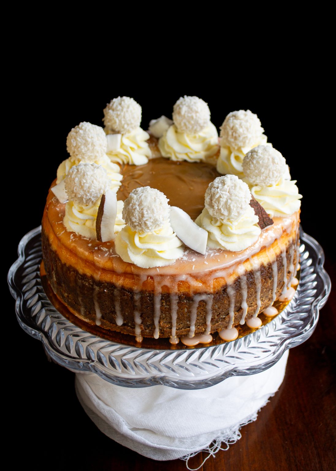 3. En el medio del pastel, colocamos una cantidad de crema de Lotus y la extendemos con una cuchara. Alrededor, con ayuda de una manga con boquilla de estrella, escudillamos montículos de crema de queso y decoramos con coco deshidratado y unos bombones Rafaello.