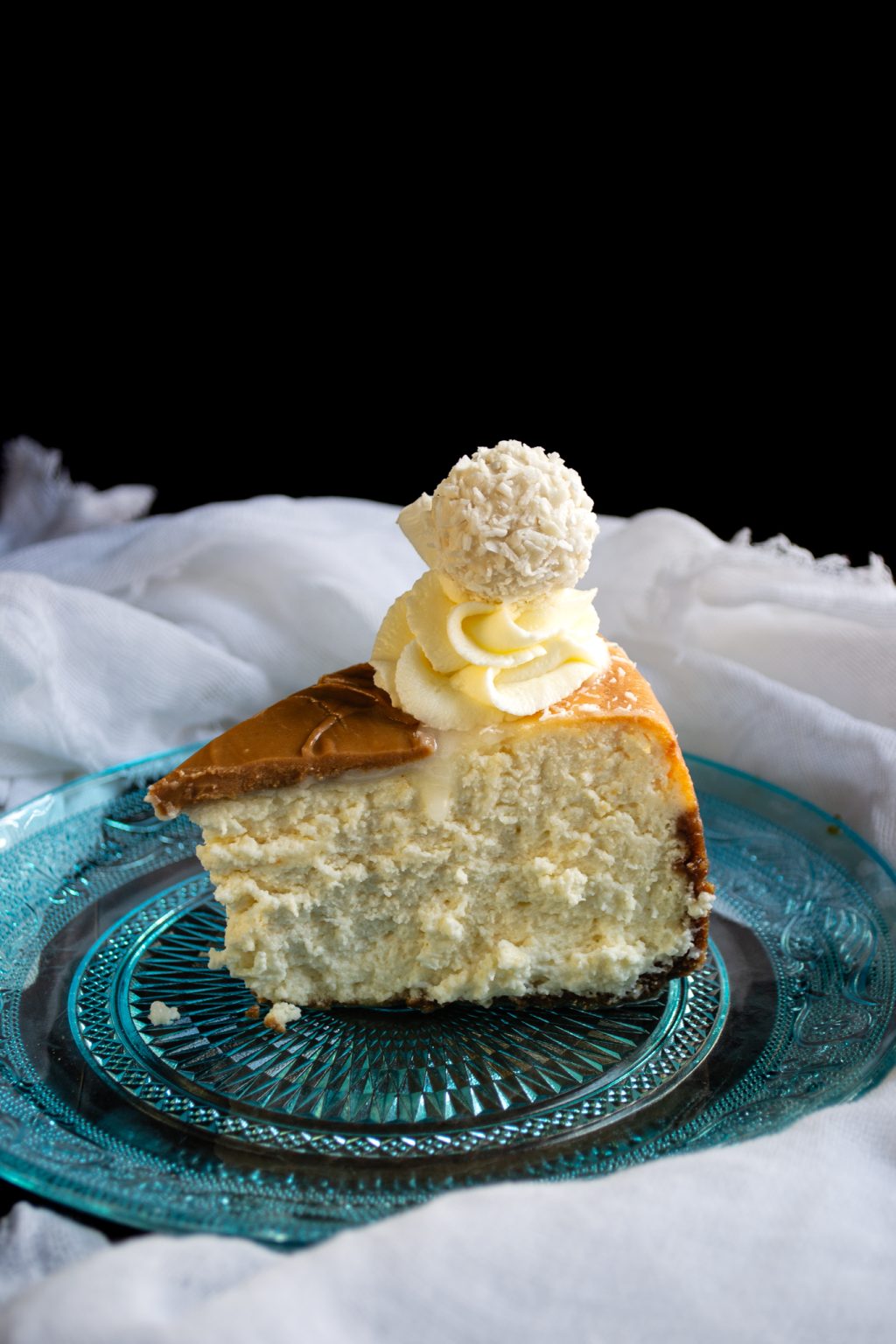 Para aquellos de mente intrépida, seres eternamente pensantes en los mares del lejano Caribe y en los frutos que caen con gloria bendita de los árboles frutales de aquel llamado paraíso, esta es vuestra cheesecake. Si adoráis el coco hasta tal punto que, de estar en una isla desierta, no dudaríais en apodarlo Viernes, aquí tenéis vuestro pastel. Si, además de esta pasión indomable por las frutas del Caribe, sentís una devoción loca por esas galletitas que os ponen con los cafés y que tienen un gusto irresistible a especias nórdicas, aquí está… Llegados a este punto me estoy quedando sin sustantivos precedidos de determinantes posesivos, así que será mejor que corte de una vez esta disertación deslucida sobre las pasiones de la persona moderna y me centre en la receta. Antes de ello, no obstante, permitidme mostraros con mis próximas palabras no más que una pequeña pista del valor gustativo de esta humilde cheesecake. Como os he dicho, si os gusta el coco, y además esas galletas especiadas llamadas Especuloos, este pastel consigue aunar los dos sabores sin excesos ni empalagamientos, para que, como aquellos cocos caídos de los árboles del caribe, os deje la cabeza loca.